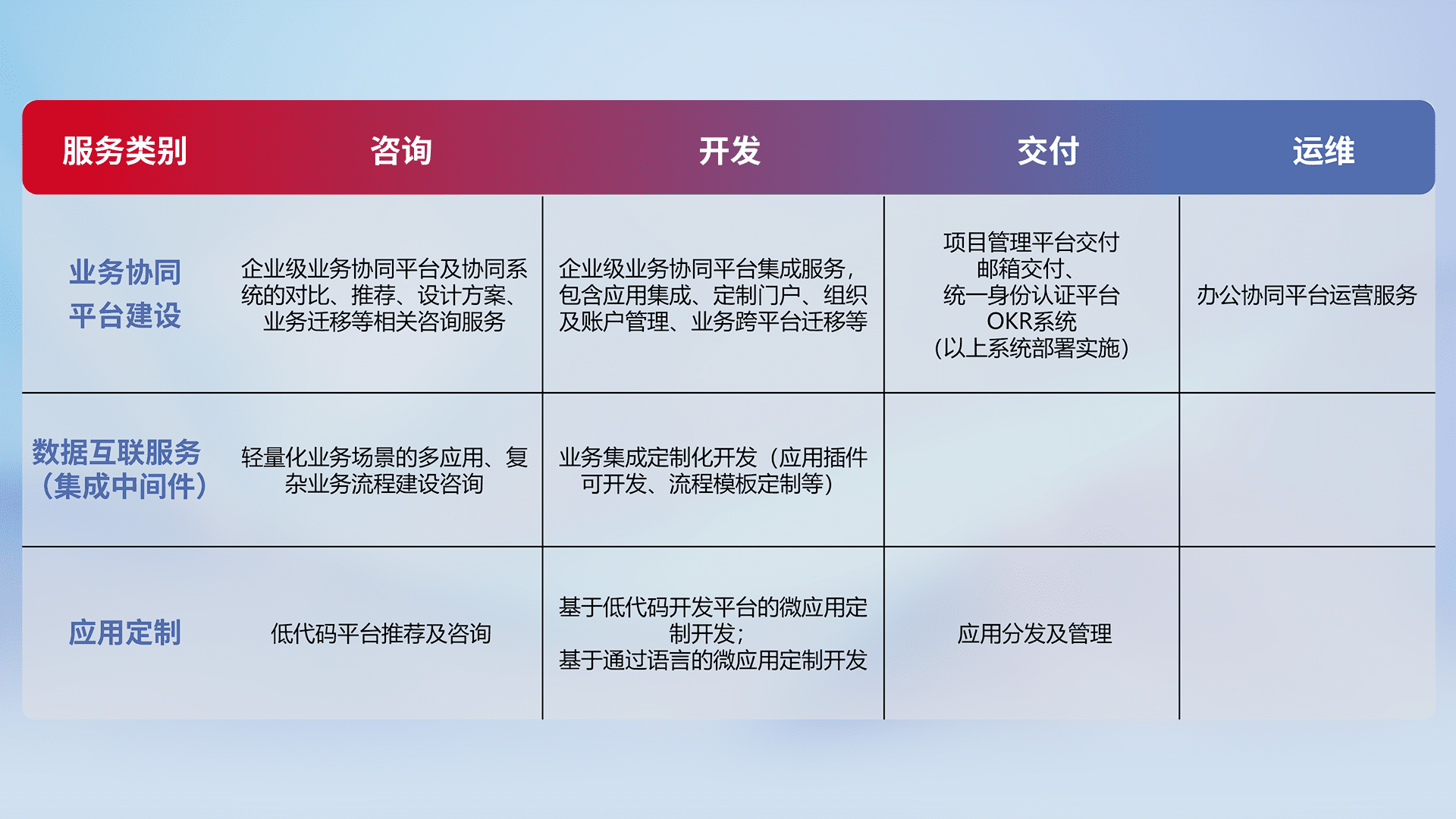 针对钉钉、、企微、、、、IDaas等平台级产品提供产品的规划、、、、方案、、交付、、、定制化开发等服务,,,,实现如统一协同办公、、、智能客户服务、、、混合会议管理、、、、智能数据查询、、、、等业务场景,,,实现数字化转型。。。。